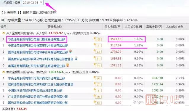 龍虎榜,2016年2月4日,賣方營業(yè)部。“華泰浙江分公司”、“華泰廈門廈禾路”“中信保定東風(fēng)中路”全部出貨,買方零散的營業(yè)部都是接盤的。華泰浙江分公司這一筆,兩個(gè)交易日一進(jìn)一出至少賺了1.5個(gè)漲停板。廈禾路和中信保定東風(fēng)中路也有的大肉吃。