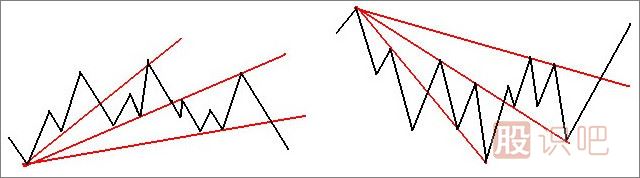 扇形三條線有一個(gè)明顯的特色,趨勢線之間的夾角大致相等,這可作為協(xié)助我們?nèi)【€的輔助觀察法。