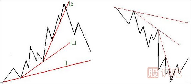 上升趨勢中,沒有跌破主趨勢線L1以前,代表股價(jià)仍有機(jī)會(huì)創(chuàng)新高。當(dāng)股價(jià)跌破次要趨勢線L2時(shí),往往代表多頭走勢即將結(jié)束或已經(jīng)結(jié)束,并有機(jī)會(huì)測試主趨勢線。原始上升趨勢線的角度較為平緩,同時(shí)也不容易被跌破,萬一被跌破則強(qiáng)烈暗示主趨勢已經(jīng)被改變,未來股價(jià)出現(xiàn)上漲都視為反彈。