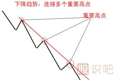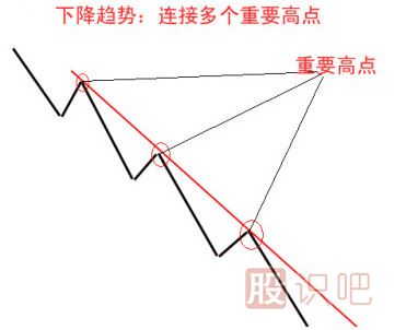 相反,若處于下降趨勢,股價(jià)波動(dòng)必定向下發(fā)展,即使出現(xiàn)反彈也不影響其總體的跌勢,把各個(gè)反彈的高點(diǎn)相連,我們會(huì)驚奇地發(fā)現(xiàn)它們也在一根直線上,我們把這根線稱為下降趨勢線。