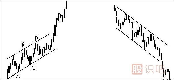 在上漲走勢中,利用谷底決定上升趨勢(支撐線),再取并行線切過股價(jià)波動(dòng)的上緣(壓力線),這兩條線合稱“上升通道”。