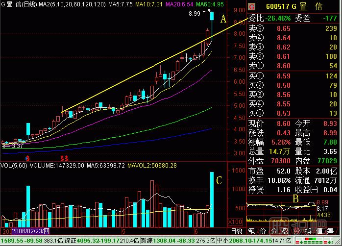 從日K線圖上看(圖281-2),G置信昨天越過高點(diǎn)連線,有加速上升的跡象。只是因?yàn)?u>成交量不充足,可理解為躍躍欲試狀態(tài)。今天跳空高開在8.93元,離漲停板8.99元僅0.06元之差。原以為可瞬間一步漲停,沒料到當(dāng)天上證指數(shù)大暴跌。這樣的莊家,在錯(cuò)誤的時(shí)機(jī)發(fā)動(dòng)攻勢(shì),也有點(diǎn)難以置信。不過,從昨天躍躍欲試的隱蔽性動(dòng)作,到今天跳空高開的爆發(fā)性突破高點(diǎn)連線,這些動(dòng)作一氣呵成,也順理成章。圖中的A點(diǎn),長長的下影線成了反壓高點(diǎn)連線,也是標(biāo)準(zhǔn)的廣通技術(shù)。C處的巨量是“頂天立地量”,是多空大搏殺的結(jié)果。成交量柱體圖是白色陰量,這是因?yàn)?a href=http://m.pontderentat.com/GPRM/sy/1216.html target=_blank class=infotextkey>收盤價(jià)低于開盤價(jià),被認(rèn)為是陰量。但有的軟件規(guī)定,今日收盤價(jià)高于昨日收盤價(jià),皆作為紅色陽量。我們深知這是“引體向上”形態(tài),其多空形勢(shì)就一目了然,無所謂成交量柱體圖的白色紅色了。