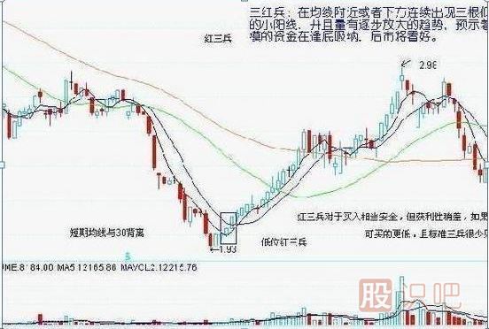 在均線附近或者下方連續(xù)出現(xiàn)三根低開(kāi)高收的小陽(yáng)線,并且量有逐步放大的趨勢(shì),預(yù)示著有小規(guī)模的資金在逢底吸納,后市將看好。