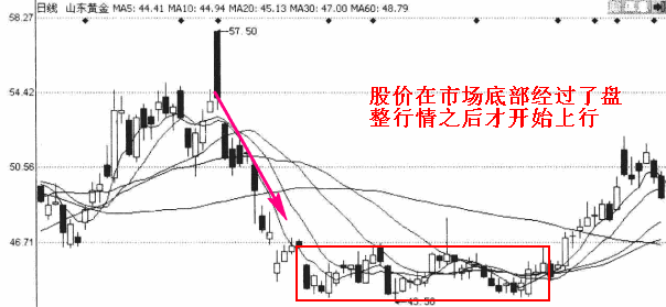 如下圖上凍黃金日K線圖,股價(jià)在市場(chǎng)底部經(jīng)過(guò)了盤整行情之后才開(kāi)始上行。
