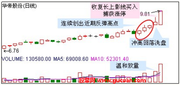 三、當(dāng)股價(jià)攻破長(zhǎng)上影陽K線高點(diǎn)后,伺機(jī)買入。主力成功洗盤后,次日開盤即快速拉升,盤中成功攻破長(zhǎng)上影線高點(diǎn)后,就是絕佳買入時(shí)機(jī)。如華帝股份,上周四早盤沖高回落后,給人一種短線調(diào)整的感覺,而次日低開后即快速翻紅,并再創(chuàng)近期新高,這就是絕佳的買入時(shí)機(jī)。