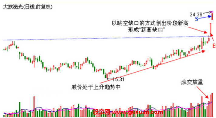 2、出現(xiàn)缺口當(dāng)日,股價(jià)開盤即展開強(qiáng)勁拉升,絲毫沒有回補(bǔ)缺口的跡象;
