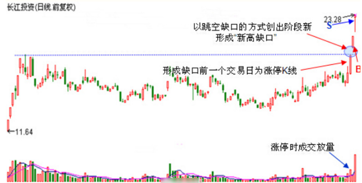 1、缺口出現(xiàn)前一個(gè)交易日為漲停K線或帶上影線的K線,且漲停對(duì)應(yīng)的量能明顯放大;
