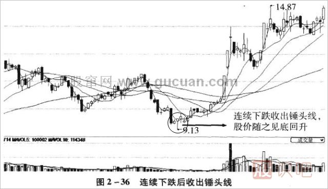 1.錘頭線形似“錘子”,無上影線,有下影線,在下跌過程中出現(xiàn),一般是見底的信號(hào)。