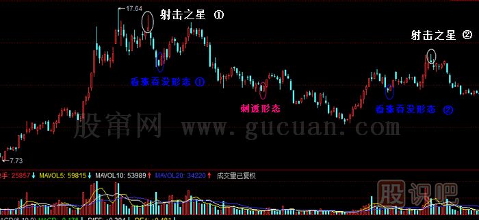 6.理想狀態(tài)是射擊之星次日是向下跳空的長長的陰線并深入射擊之星前K線的實體。