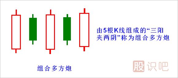 多方炮,即多方準(zhǔn)備“開(kāi)炮”,一般出現(xiàn)這種K線圖形,股價(jià)后市上漲的概率極大,是短線較好的介入點(diǎn)。有時(shí)候,這種形態(tài)會(huì)變異成“三陽(yáng)夾兩陰”,這是組合多方炮,如圖2所示。