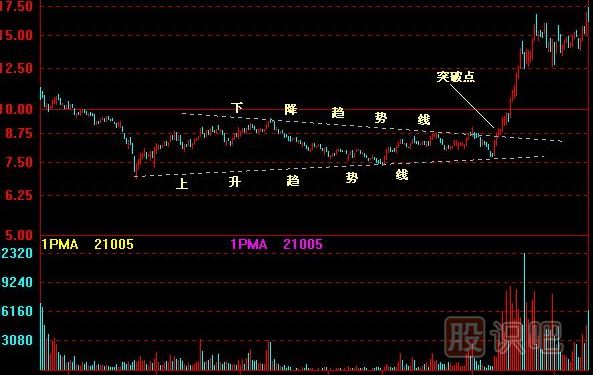 對(duì)稱三角形由一系列的價(jià)格變動(dòng)所組成,其變動(dòng)幅度逐漸縮小,亦就是說每次變動(dòng)的最高價(jià),低于前次的水準(zhǔn),而最低價(jià)比前次水準(zhǔn)為高,呈一壓縮圖形,如從橫的方向看股價(jià)變動(dòng)領(lǐng)域,其上限為向下斜線,下限為向上傾線,把短期高點(diǎn)和低點(diǎn),分別以直線連接起來,就可以形成一相當(dāng)對(duì)稱的三角形。對(duì)稱三角形成交量,因愈來愈小幅度的股價(jià)變動(dòng)而遞減,然后當(dāng)股價(jià)突然跳出三角形時(shí),成交量隨之變大。