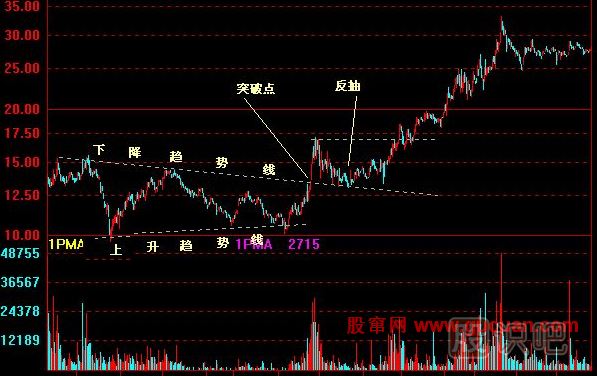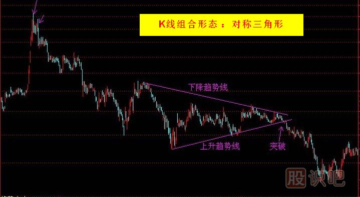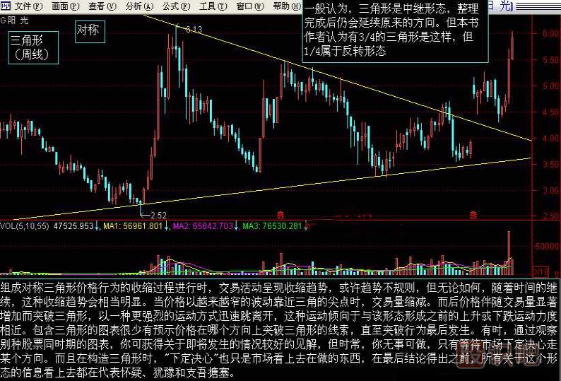 (5)對(duì)稱三角形突破后,可能會(huì)出現(xiàn)短暫的反方向移動(dòng)(反抽),上升的后抽止于高點(diǎn)相連而成的型態(tài)線,下跌的后抽則受阻于低點(diǎn)相連的型態(tài)線之下,倘若股價(jià)的后抽大于上述所說的位置,型態(tài)的突破的可能有誤。