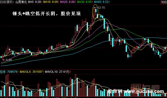 實(shí)例2:如圖所示,2009年8月5日,山西焦化(600740)經(jīng)過(guò)連續(xù)三根大陽(yáng)線的上漲之后,收出一根陰錘頭線,此時(shí)多方已成強(qiáng)弩之末,