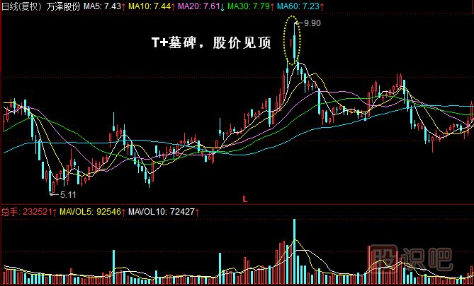 實(shí)例3:如圖所示,2009年12月8日,萬(wàn)澤股份(000534)收出一根T字線,此時(shí)多頭還很強(qiáng)勁,但明顯力道不足。次日該股收出一根高開(kāi)低走的大陰線,形成T+墓碑的組合。此時(shí)獲利的投資者就不應(yīng)該貪婪地死捂,而應(yīng)當(dāng)選擇賣出,之后該股果然短期連續(xù)殺跌超過(guò)20%,由于主力還沒(méi)有出完貨,該股跌下來(lái)之后又展開(kāi)了一波反彈,但之后還是繼續(xù)跌。
