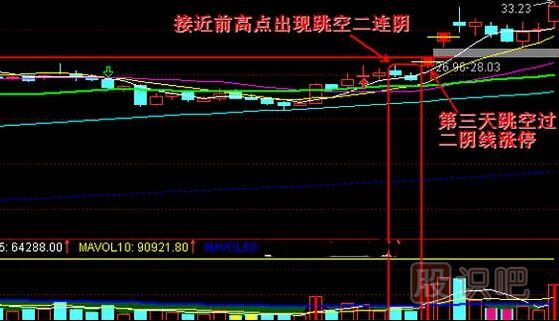 1)股價(jià)經(jīng)過(guò)一波連續(xù)上漲之后,在接近前期頭部或近期的新高收出一根陰線,第二天跳空低開(kāi)再收一根陰線,形成跳空兩根陰線洗盤;