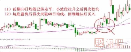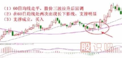 操作方法:個(gè)股在長期下跌后,股價(jià)第一次站上60均線,急進(jìn)的投資者可以跟進(jìn),穩(wěn)健的投資者可以等到股價(jià)洗盤回調(diào)到60均線附近區(qū)域得到支撐買入,極其準(zhǔn)確。